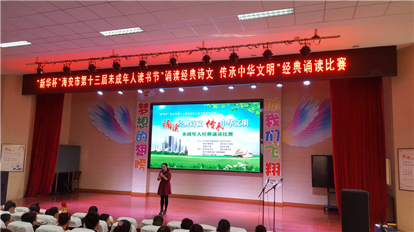 本网讯10月26日,江苏省海安市教育局、老促会教育分会联办的“新华杯”海安市第十三届未成年人读书节系列活动之“诵读经典诗文 传承中华文明”未成年人经典诵读比赛在城南实验小学隆重举行,来自全市的79名中小学生参加了此次活动。