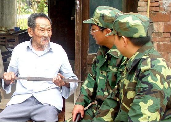 百岁老民兵与两把军刀的故事 2005年,当时的五甲镇人武部长季国江告诉我,他们镇平和村20组有位百岁老民兵瞿立范家里珍藏了两把军刀,分别是他在任乡民兵队长时从日本鬼子和还乡团头目手中夺得、经领导同意后留在身边用于杀敌的,并一直保存着。联想到当年正逢纪念抗日战争胜利60周年,我想这个题材一定很有意义。我先后两次坐公交车到老人家里、村里、其亲戚和邻居家里采访。 瞿立范是1937年参加革命、1941年入党,2005年正好100岁。他先后参加了抗日战争和解放战争,立过功、受过无数次嘉奖。在抗日战争时期,瞿立范任乡民兵队长,经常带领民兵与鬼子周旋,配合地方部队与日本侵略者英勇斗争。为了应对鬼子的扫荡,瞿立范和众多民兵从来不住家里,即使过年也不回家,睡猪圈、蹲桥洞是常事。尤其是拥有两把军刀以后,瞿立范在一次战斗中,用军刀砍掉敌人机枪手的手臂。1942年,瞿立范还在本地参加了有名的谢家渡战斗和后来的渡江战役等战斗,在渡江战役中,时任支前中队长的他带领民工随军运送粮食,还荣立了三等功。 后来,我先后促成当地供电公司等几个单位的民兵上门为老人提供服务,并接受爱国主义教育(如图),收到了良好的效果。 穿越蘑菇云:珍藏了40年的秘密