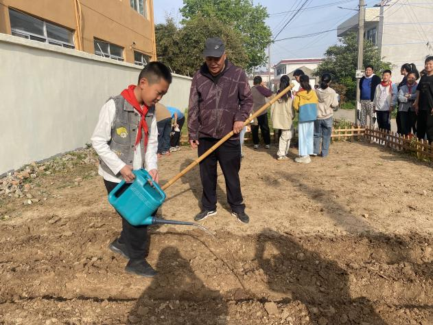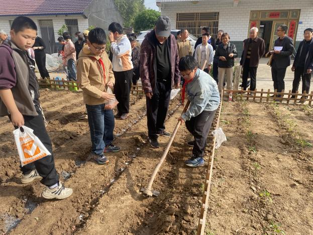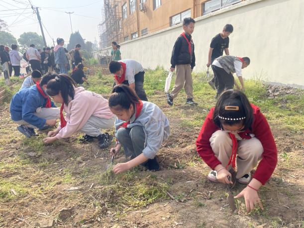 播 下 希 望 大家认真地将花生种均匀地撒入坑中,每一颗种子都承载着学生们对收获的期待。撒完种子后,便是覆土和压实。队员们拿起锄头,仔细地将每个土坑填平,再轻轻压实。整个过程中,孩子们热情高涨,欢声笑语,分享着成功的喜悦、劳动的快乐和对未来的美好渴望。