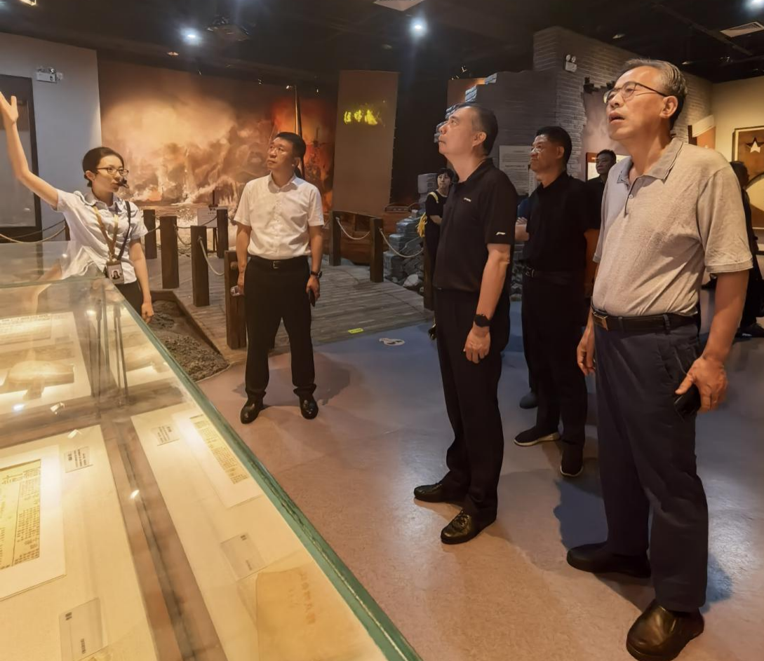 阎立一行首先来到苏中四分区反“清乡”斗争资料陈列馆。该陈列馆是南通唯一的抗日纪念馆,总投资9000万元,占地面积31亩,建筑面积6000平方米,展陈面积3700平方米。以“江海挽狂澜、铁流铸忠魂”为展示主题,全景展现了南通人民取得反“扫荡”阶段性胜利,粉碎日伪军事、政治、经济、思想“清乡”阴谋,夺取反“清乡”及抗战最后胜利的过程。九一八事变和七七事变之后,中国共产党领导武装力量先后开赴抗日前线,相继开辟了晋察冀、晋冀豫、苏北、苏南、苏中等19块敌后抗日根据地,组成了与正面战场相配合的华北、华中、华南三大敌后战场。其中,粟裕将军领导的新四军一师兼苏中军区是华中抗日根据地的坚强前哨阵地,其重要组成部分——苏中四分区,更是苏中区抗日民主根据地的一面旗帜。反“清乡斗争”与红十四军武装斗争和苏中七战七捷构成了屹立江海大地的三座历史丰碑,成为南通宝贵的精神财富和不竭的力量源泉。