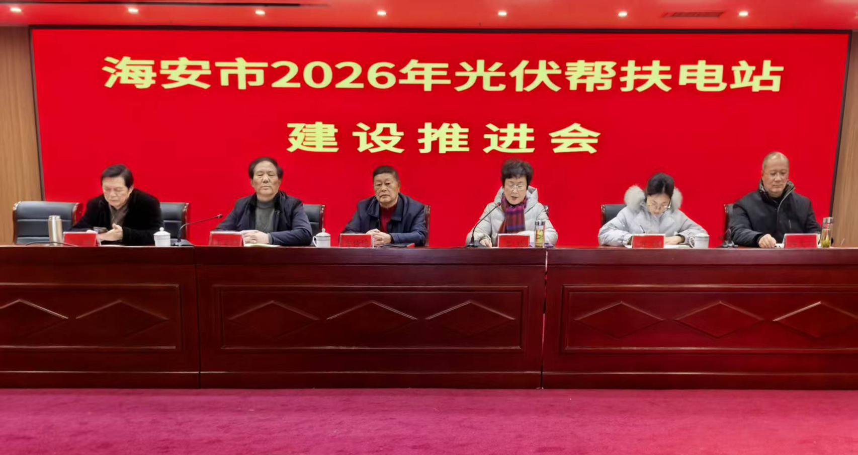 为有序推进光伏帮扶电站建设,切实巩固脱贫攻坚成果,有效助力乡村振兴,确保全市2026年光伏帮扶电站建设行政村覆盖率达到80%,2028年实现村村全覆盖,1月27日下午,江苏省海安市农业农村局、市乡村振兴和老区开发促进会、市慈善总会在市老干部局十五楼会议室召开全市2026年光伏帮扶电站建设推进会。海安市乡村振兴和老区开发促进会理事长吉传稳、副理事长吴玲、副理事长兼秘书长朱立稳、市农业农村局副局长肖娟、市慈善总会副秘书长汤成林、市乡村振兴和老区开发促进会副秘书长陆志强出席会议。各区镇、街道乡村振兴和老区开发促进分会理事长、常务副理事长、副理事长、各建设村主要负责人、各有关部门负责人参加会议。