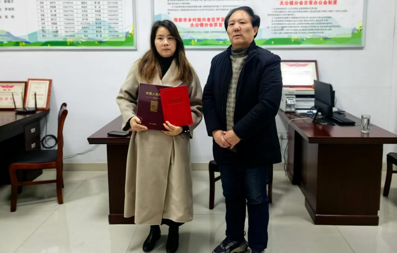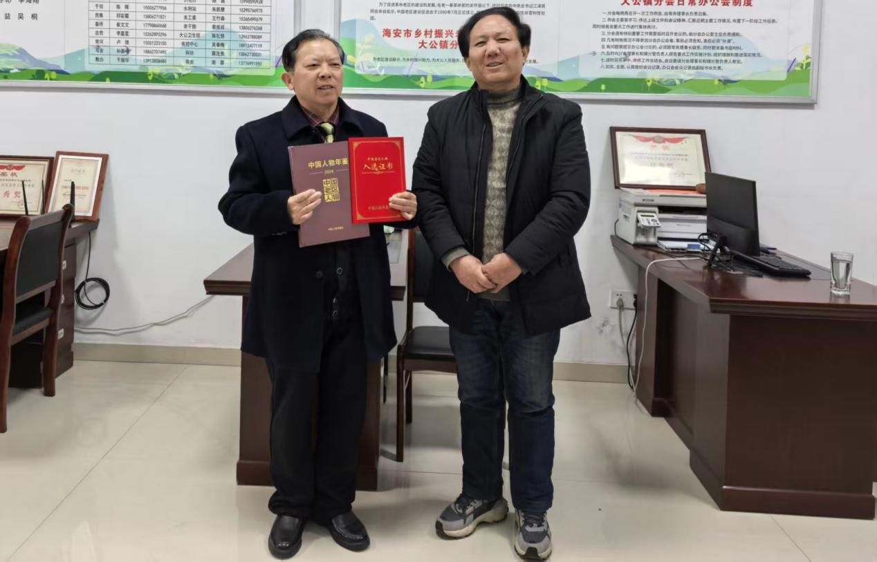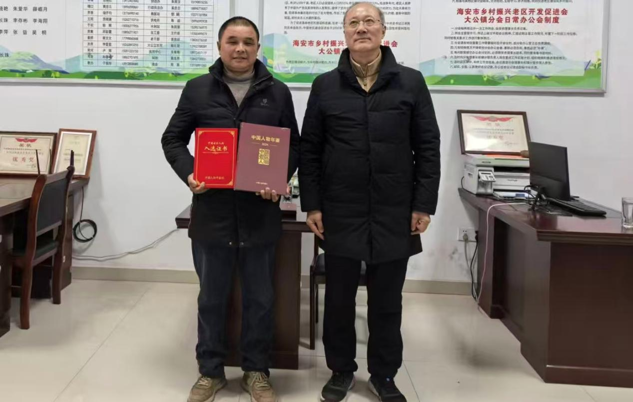 近日,《中国人物年鉴·中国老区人物(2024)》正式出版发行。作为国家级人物年鉴平台首次聚焦革命老区的重磅典籍,该书系统收录了23个省(区、市)1465名老区建设者的先进事迹。其中,海安市共有10人光荣入选,大公镇独占3席,罗进、周小兵、王爱英三位同志凭借在老区建设、乡村振兴中的突出贡献,跻身国家级年鉴名录,彰显了大公镇老区建设的扎实成效。 本月5日上午,海安市乡村振兴、老区开发促进会副理事长兼秘书长朱立稳,副秘书长陆志强专程赶赴大公镇,为罗进、周小兵、王爱英三位入选者现场赠书颁证,向他们致以热烈祝贺。大公镇分会全体工作人员全程参与活动,共同见证这份属于大公老区建设者的荣耀。